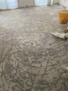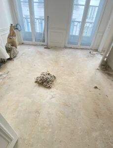 Autre mauvaise surprise un peu moins problématique ; sous la moquette, une épaisse couche de ragréage* a été (malencontreusement) passée sur le parquet. Si la couche est fine, la réalisation d'un ponçage rapide sera suffisant. Si la couche est épaisse, le ponçage pourra prendre plusieurs jours.
