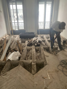 Une fois le chantier finalisé. Sous la moquette et le ragréage, un très beau parquet en Point de Hongrie - Photographe : Géraldine Andrieu.