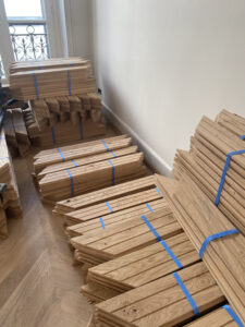 Pour que la totalité de la pièce avec un même parquet en Point de Hongrie, il a fallu rajouter des lambourdes d'une manière transversale à celles existantes et attendre le séchage des scellements, ce qui a pris plus de 8 semaines.