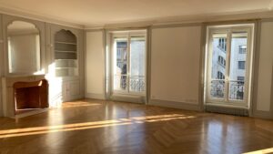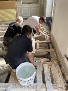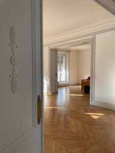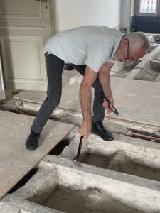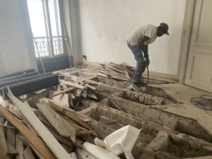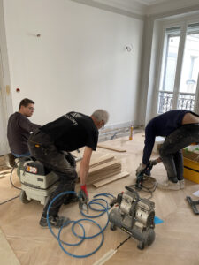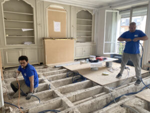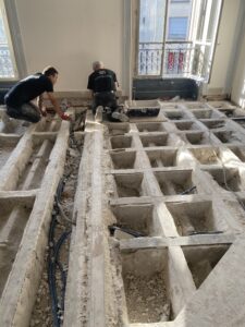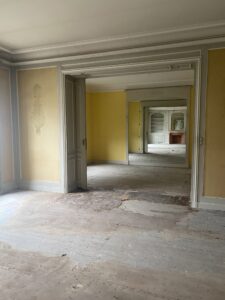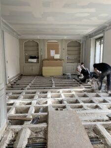 Le scellement de nouvelles lambourdes a été obligatoire pour permettre que l'ensemble du grand salon ait un parquet en Point de Hongrie sur la totalité de la pièce.