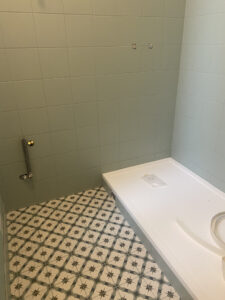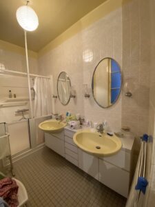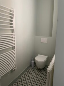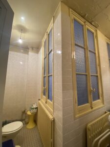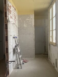 Ensuite, une 2ème salle de bain a été créée en prenant en partie sur la salle de bain existante et en grande partie sur le long couloir qui desservait le local chaudière ; une grande douche d'un côté, une baignoire de l'autre. L'ancienne salle à manger a été transformée en chambre. Le "petit" salon en salle à manger.