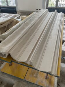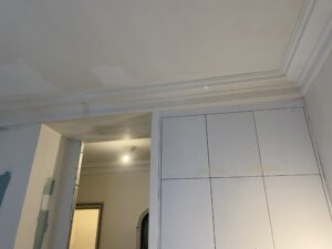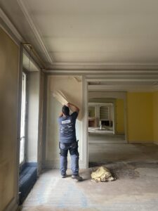Dans l'entrée et la nouvelle chambre, de nouvelles corniches en staff réalisées d'après un gabarit pris sur place ont été installées de part et d'autre de la cloison... comme si cette configuration avait toujours existé !